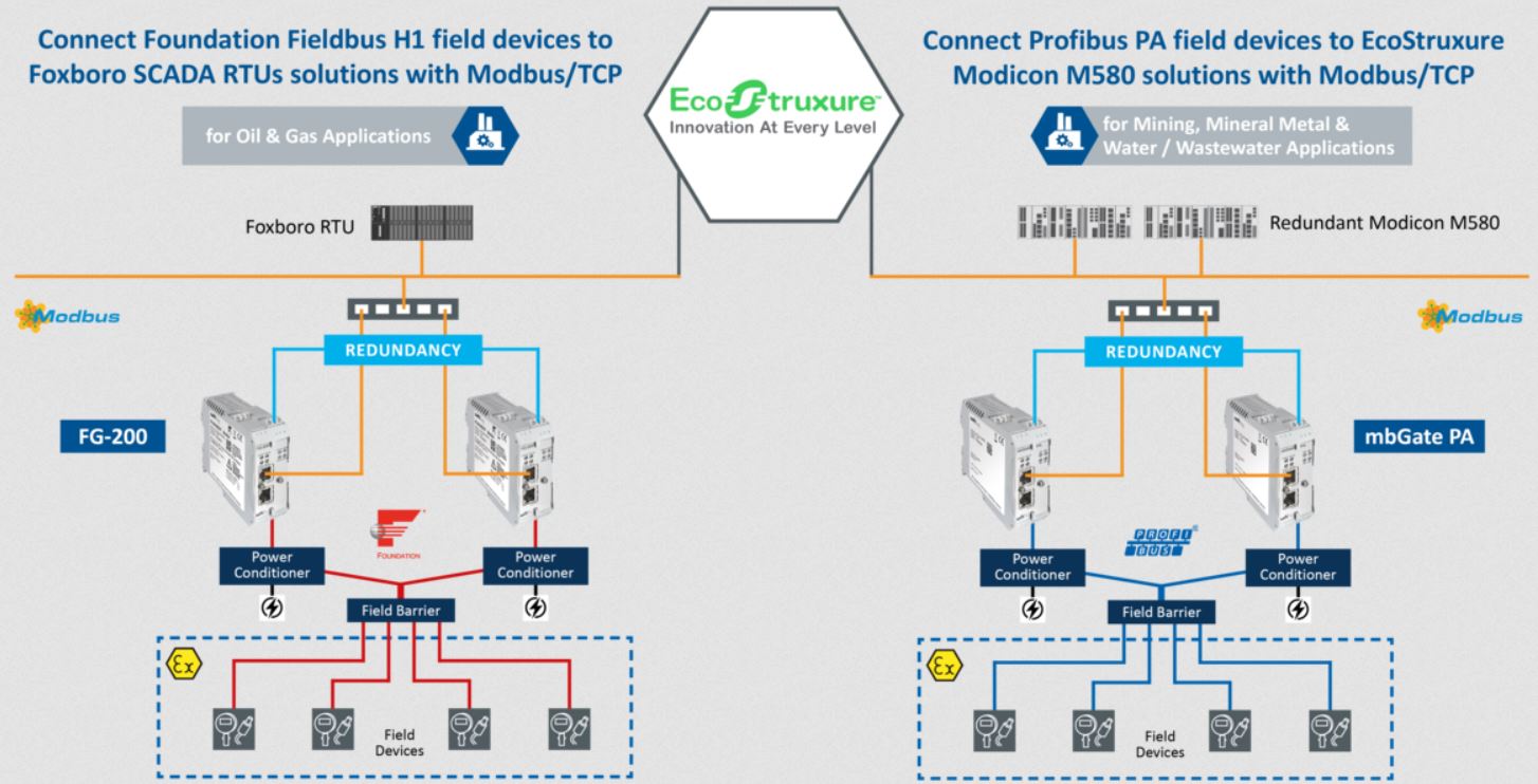 Softing作为施耐德电气的长期合作伙伴,提供 mbGate PA (Modbus to PA gateway)等多协议转换网关,将PROFIBUS PA现场设备连接到EcoStruxure Modicon M580 Modbus/TCP,实现各种协议和现场设备的直接互连,支持冗余。
