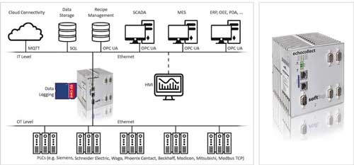 Softing (INAT) echocollect用于数据收集和数据记录,它收集PLC过程数据并提供给ERP系统。该设备基于标准的TCP/IP通讯,2个独立的以太网口将办公网络和生产网络进行隔离。