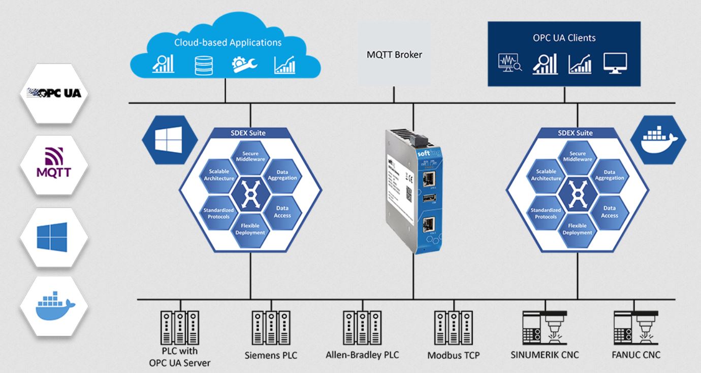 SDEX套件通过OPC UA和MQTT协议安全连接PLC与CNC,实现Windows、Docker及工业硬件之间的标准化、可扩展数据集成。它简化了机器互联流程,强化了网络安全,加速了工业数字化进程。